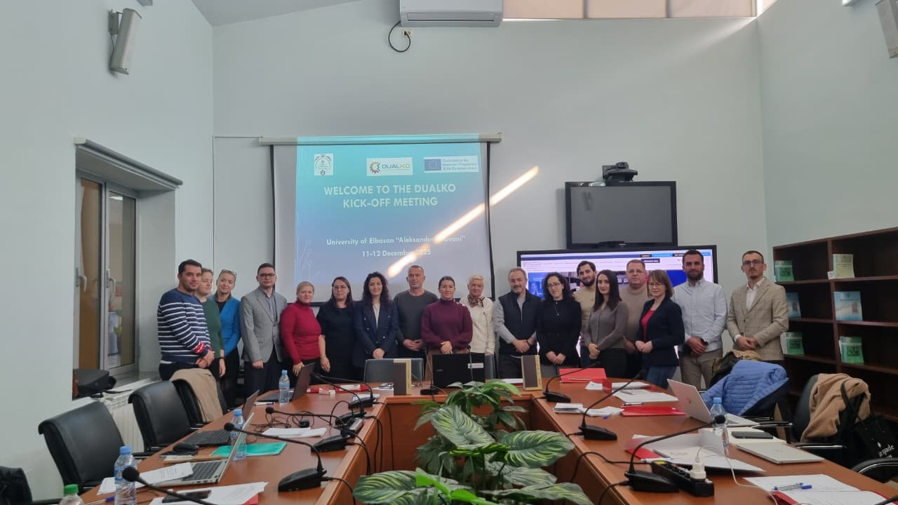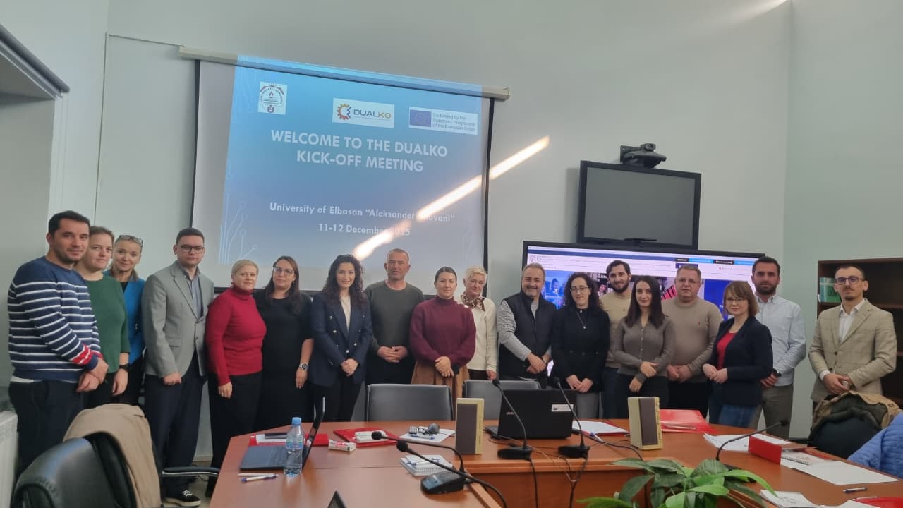 The DUALKO project — “Strengthening of Relations between Higher Education Institutions and the Industry Sector through Dual Education in Albania and Kosovo, with a Focus on ICT” — officially started with its Kick-Off Meeting held on 11–12 December in Elbasan, hosted by the University of Elbasan “Aleksandër Xhuvani”.
